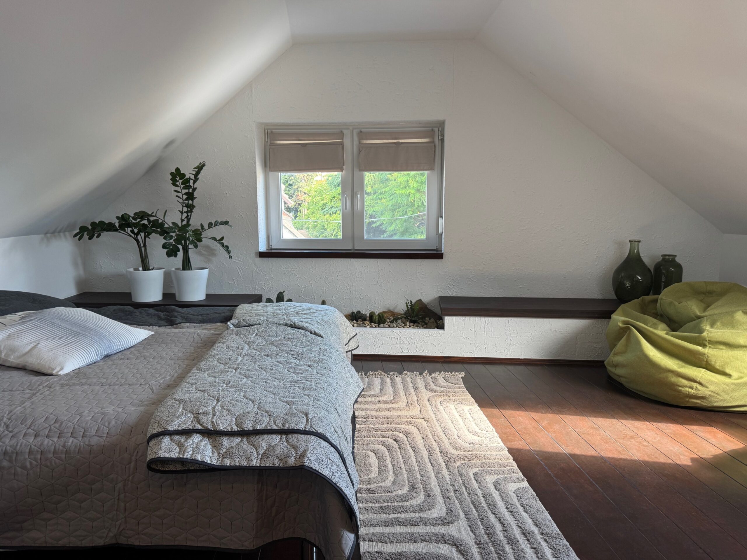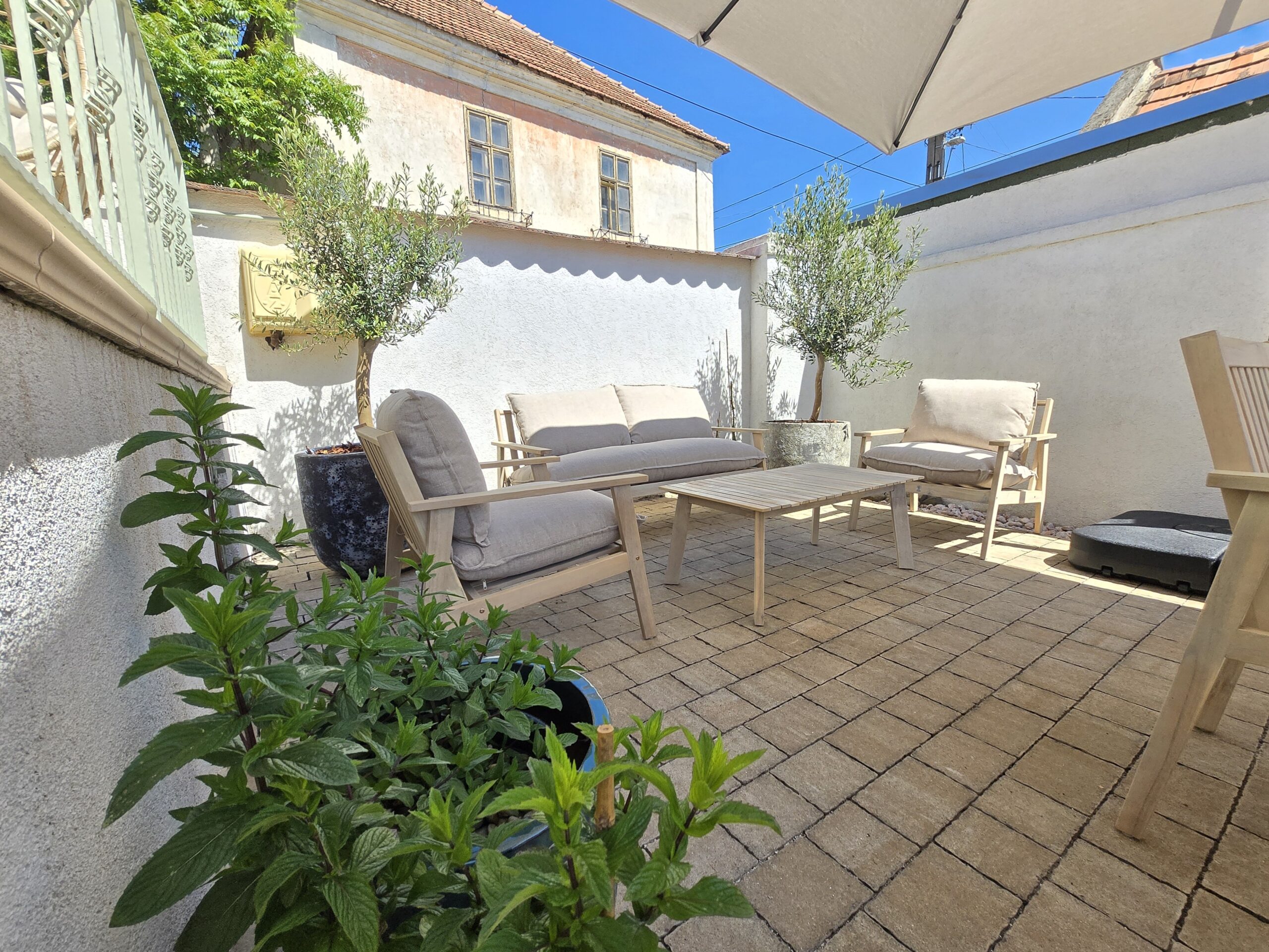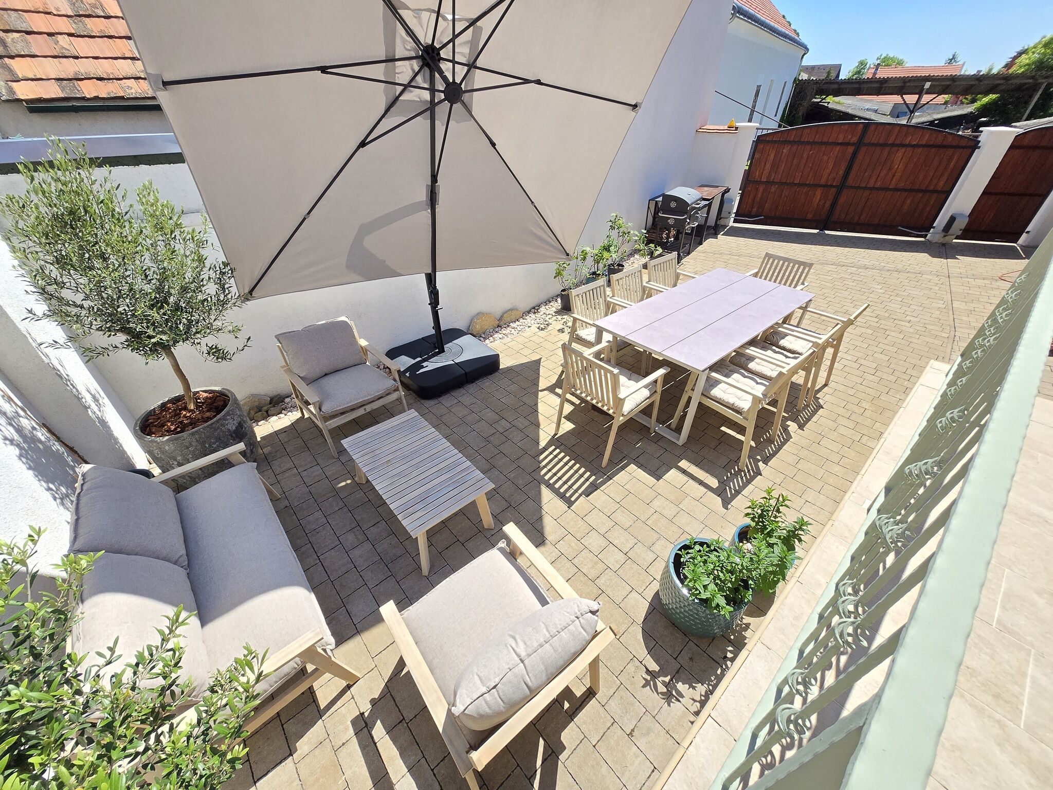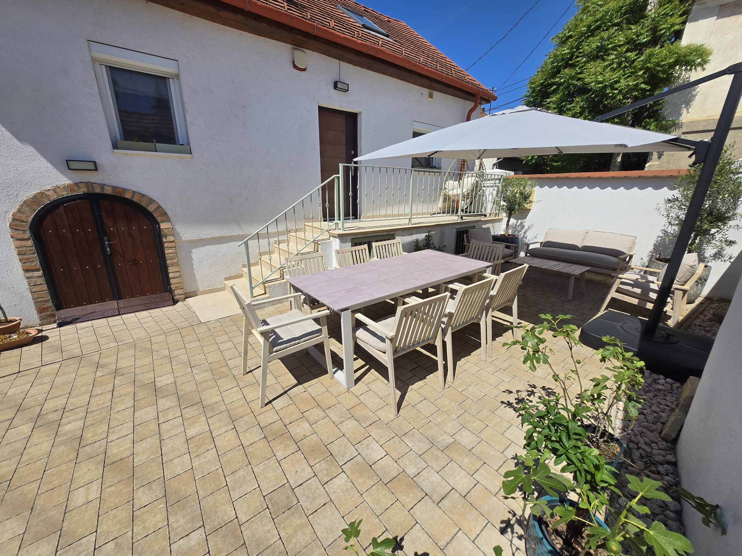 Minden oldalról zárt a kert, ahol egy grillező, egy nagy asztal és egy kényelmes kertibútor van minden napszakra, étkezésre – játékra alkalmas kiegészítőkkel.